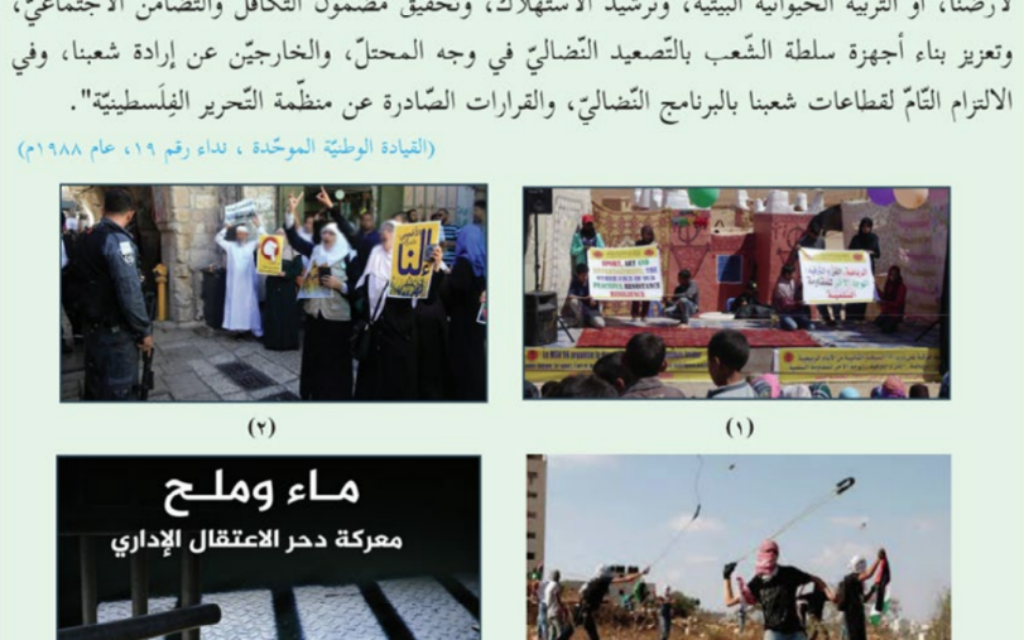 In another guide, for 10th-grade modern history and geography, armed resistance is presented as one of the legitimate ways to “rise up against the settlements in Palestine.”
