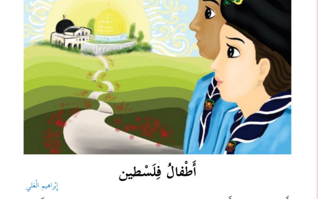 Haifa and Jaffa are within Israel’s internationally recognized borders, and Israel annexed East Jerusalem, which contains the Dome of the Rock and the Al-Aqsa Mosque, more than four decades ago. The poem appears with an illustration of a boy and girl in Palestinian scout uniforms gazing toward Jerusalem.