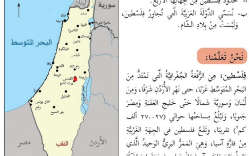 The erasure is reflected in maps as well, which omit Israel. In a 6th-grade social studies book, only Palestine is shown on the land between the Jordan River and the Mediterranean Sea.