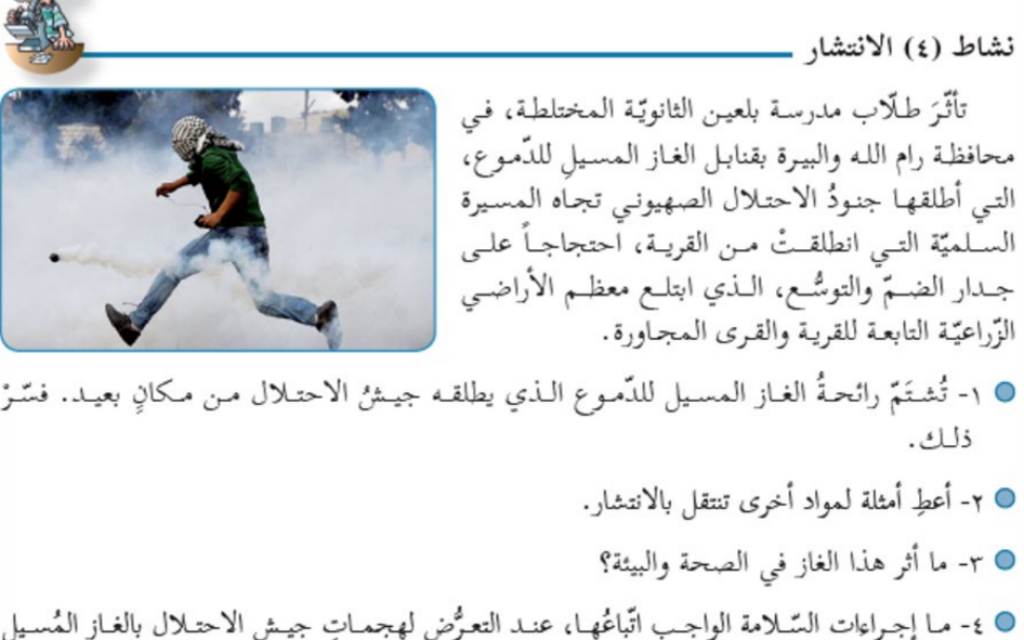 Later in the same book, students study human physiology through a narrative of Israeli soldiers firing tear gas and smoke grenades at a youth camp near Ramallah.