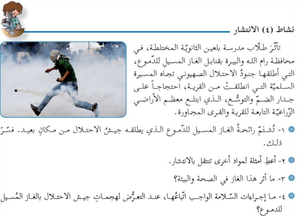 In an 8th-grade science textbook, students learn about elements of air through a story describing Israeli security forces launching tear gas in the Ramallah area of the West Bank. Next to the passage, there is a photo of a masked individual holding a slingshot.